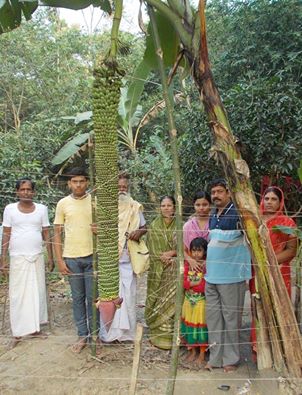 হট নিউজ, বাগদা-উঃ২৪পরগনা, আজব কলার কাঁদি দেখতে ভীড় জমছে উঃ২৪পরগনা জেলার বয়রা দাস পাড়ার জলের ট্রাংকি সংলগ্ন হরেকৃষ্ণ দাসের বাড়ীতে৷ কয়েক মাস আগে হরেকৃষ্ণ এক পড়শির কাছ থেকে দুটো কাঁচ কলার চাঁরা এনে তার বাড়ীতে রোপন করলে গত আড়াই মাস পুর্বে কাঁচকলা গাছে রহস্যজনক ভাবে নতুন ধরনের এই কলার কাঁদি পড়ে৷ এই রিপোর্ট লেখা পর্যন্ত কলার কাঁদিটি ১০ ফুট মত লম্বা হয়েছে৷ এই কাঁদিতে এ পর্যন্ত ৭৬ লাইন কলা ধরেছে প্রতিটি লাইনে ৫৭ পিস করে কলা রয়েছে৷ সব মিলিয়ে এই কাঁদিতে এ পর্যন্ত ৪৩৩২ পিস কলা ধরেছে৷ রহস্যজনক কলার কাঁদি মালিকের বক্তব্য, গাছটিতে মোচা পড়ার সময় মোচার সাইজ যেমন ছিল, ৪৩৩২ পিস কলা ছাড়ার পরও নাকি মোচার সাইজ একই রয়েছে৷ কাঁদি মালিক হরেকৃষ্ণ বাবুর দাবী, মোচা অনুযায়ী কাঁদিটি এখনো কয়েক ফুট লম্বা হবে৷ কয়েক জন বয়স্ক কলারকাঁদি দর্শনার্থীদের বক্তব্য, তাঁদের জীবনে এমন কলারকাঁদি আর দ্বিতীয়টি কোথাও দেখেননি৷ কাঁচকলা গাছে আজব কলার কাঁদি হওয়াতে কলাগাছে দেব-দেবী ভর করেছে ভেবে এলাকার ধর্মমনা লোকজন কলাগাছের গোড়ায় ধূপ, প্রদীপ জ্বালিয়ে ফুল, পয়সা ও প্রসাদ দিয়ে রীতিমত পূজা শুরু করে দিয়েছে৷
