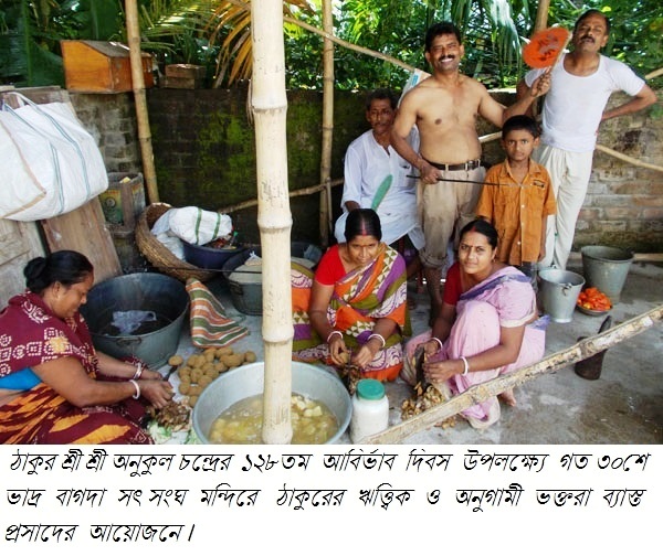 হট নিউজ, বাগদা: ঠাকুর শ্রী শ্রী অনুকুল চন্দ্রের ১২৮তম আবির্ভাব দিবস উপলক্ষ্যে গত ৩০শে ভাদ্র ঠাকুরের অগনিত ও ঋত্ত্বিকগনের সমন্বয়ে এক মহা-মিলন মেলায় পরিনত হলো বাগদা সৎ-সংঘ মন্দির প্রাঙ্গন৷ দিবসটি উদযাপন উপলক্ষ্যে ভক্তরা স্বানন্দে ঠাকুরের গান, আলোচনা, প্রার্থনা ও প্রসাদ গ্রহনের মধ্য দিয়ে সারাটি দিন অতিবাহিত করেন৷ বাগদা সৎ-সংঘ মন্দিরে অনুষ্ঠিত ঠাকুরের এই অনুষ্ঠানে অনুকুল চন্দ্রের দীক্ষিত ভক্তগনের সাথে এলাকার অন্যমতের দীক্ষিতরাও মিলেমিশে একাকার হয়ে যায়৷ তাদেরকেও ভক্তি সহকারে ঠাকুর শ্রী শ্রী অনুকুল চন্দ্রের প্রসাদ গ্রহন করে তৃপ্ত হতে দেখা যায়৷