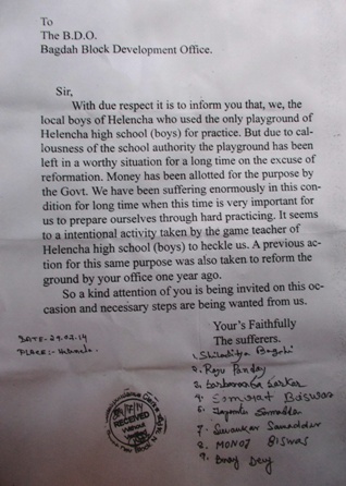 খেলার মাঠ সংস্কারে সীমাহীন গাফিলতির অভিযোগে গত ২৪শে জুলাই হেলেঞ্চার গ্রামবাসীরা ডেপুটেশন দিল বাগদা সমষ্টি উন্নয়ন আধিকারিকের দপ্তরে৷ অভিযোগ কারীরা জানিয়েছেন, উঃ২৪পরগনা জেলার হেলেঞ্চা হাইস্কুল ফুটবল মাঠটি যে শুধু হাইস্কুলের ছাত্র ছাত্রীরা ব্যাবহার করে তাই নয়৷ মাঠটি ভোরে শরীর চর্চার জন্য অত্র এলাকার ছোট থেকে বয়স্ক সবাই ব্যাবহার করে থাকে৷ এ ছাড়াও এলাকার বেকার ছেলেরা সেনাবাহিনীতে যোগদানের প্রস্তুতির প্রশিক্ষনও এই মাঠেই নিয়ে থাকে বলে জানা গেছে৷ অভিযোগ, মাঠ সংস্কারের নামে কিছু মাটি ফেলে ঢিবি করে রেখেছে স্কুল কত্তৃপক্ষ, বারবার হেড মাষ্টার মহাশয় কে জানিয়ে সুরাহা না হওয়ায় শিলাদিত্য বাগচীর নেতৃত্বে রাজু পান্ডে, সর্বেন্দু সরকার মনোজ বিশ্বাস সহ বেশ কয়েকজন এলাকাবাসী বিডিও মালবিকা খাটুয়ার দপ্তরে অভিযোগ করেন৷ হেলেঞ্চার গ্রামবাসী বাগদা ব্লক তৃণমুল কংগ্রেসের সহঃসভাপতি বাগদা পঞ্চায়েত সমিতির পূর্ত কর্মাধক্ষ্য কার্ত্তিক বাইনও ঘটনার সত্যতা স্বীকার করে গভীর উদ্বেগ প্রকাশ করেন৷