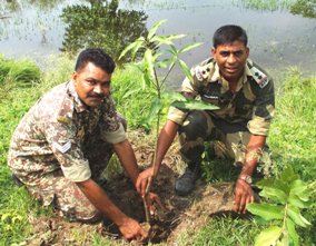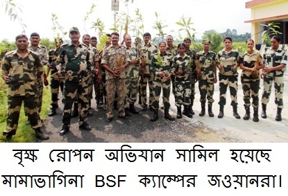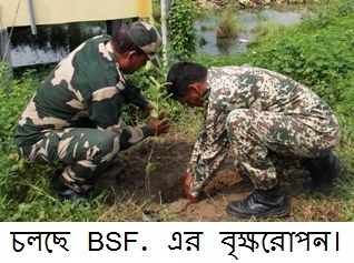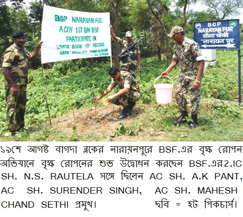 সমগ্র ভারত বর্ষের বি.এস.এফের সাথে তাল মিলিয়ে উঃ২৪পরগনা জেলার বাগদা ব্লক এলাকায় কর্মরত ফার্ষ্ট ব্যাটলিয়নের বি.এস.এফেরাও পশ্চিমবঙ্গকে সবুজায়ন করতে গত মঙ্গলবার থেক শুরু করলো বৃক্ষ রোপন অভিযান৷ বি.এস.এফের ফার্ষ্ট ব্যাটলিয়নের টু.আই.সি শ্রী এন,এস রাউথলা সকাল ১০টায় নারায়নপুর ক্যাম্প এলাকায় একটি মেহগুনীর চারা রোপন করে এই বৃক্ষ রোপন অভিযানের শুভ সূচনা করেন৷ ওই সময় টু.আই.সি সাহেবের সাথে এ.সি শ্রী এ.কে প্যান্ট্, এ.সি শ্রী সুরিন্দর সিং, এ.সি শ্রী মহেশচন্দ্র শীতয় সহ নারায়নপুর ক্যাম্পের জওয়ানেরা৷ এই বৃক্ষ রোপন অভিযানে নারায়নপুর ১৩৯পিস, পুস্তিঘাটা ৮৪ পিস ও মশ্যমপুর মামা ভাগিনা ক্যাম্পের বি.এস.এফেরা মিলে সর্বমোট ১৪০২ পিস আম, পেয়ারা, লেবু, নিম ও মেহগুনীর চারা রোপন করেন৷