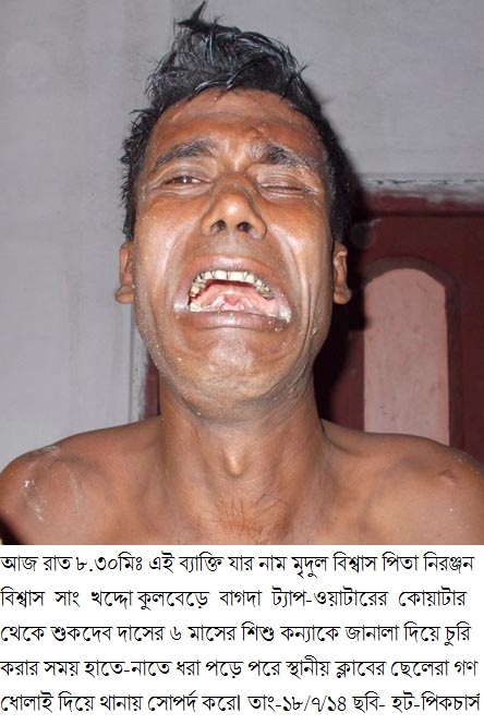 ছেলেধরা সন্দেহে এক ব্যাক্তিকে উত্তম-মধ্যম দিয়ে থানায় সোপর্দ করেছে বাগদার উজ্জ্বল সংঘের ছেলেরা৷ জানা গেছে গত ১৮ই জুলাই রাত সাড়ে আটটার সময় খোদ্দকুলবেড়ের নিরঞ্জন বিশ্বাসের পুত্র মৃদুল বিশ্বাস(৩৭) বাগদা ট্যাপ-ওয়াটার কোয়ার্টার থেকে ট্যাপ অপরেটর শুকদেব দাসের ছ’মাসের কন্যাকে জানালা দিয়ে বের করার চেষ্টা কালে হাতে-নাতে ধরা পড়ে শুকদেব দাসের হাতেই৷ শুকদেব দাসের বক্তব্য, বাজার থেকে ফেরার সময় দেখেন এক ব্যাক্তি জানালা দিয়ে হাত বাড়িয়ে খাঁটের উপর ঘুমিয়ে থাকা তার শিশু কন্যাকে ধরার জন্য বিছানার চাঁদর ধরে টেনে বাচ্চাটিকে জানালার ধারে নিয়ে আসছে৷ ওই সময় শুকদেব বাবুর চিৎকারে পাশের উজ্জ্বল সংঘের ছেলেরা ছুটে এসে পালিয়ে যাবার সময় ছেলেধরা মৃদুল বিশ্বাসকে ধরে ফেলে৷ এ ব্যাপারে ছেলেধরা মৃদুল বিশ্বাসের বক্তব্য, সে সুস্থ মানুষ নয়, সে নাকি পাগল৷ সেদিন সে বাচ্চাটাকে অপহরনের উদ্দেশ্যে নয়, কোলে নিয়ে একটু আদর করার উদ্দেশ্যেই বাচ্চাটাকে জানালা দিয়ে বের করার চেষ্টা করছিল৷ মৃদুল বিশ্বাস একজন পেশাদার মাতাল সে কারনে তার স্ত্রীও তাদের একমাত্র পুত্র সন্তানকে নিয়ে তাকে ছেড়ে বাপের বাড়ী চলে গেছে৷ জানালা দিয়ে শুকদেব বাবুর সন্তানকে দেখে হঠাৎই নিজের সন্তানের কথা মনে পড়াতে সন্তানস্নেহে তার নাকি হিতাহিত জ্ঞান ছিলনা৷